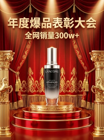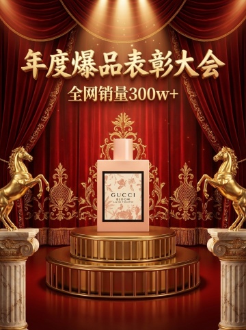 鎏金风与霓虹灯风交织,3D立体舞台呈现跨年盛典氛围,重拟物家电陈列于透明展台,搭配综艺感灯光与喜庆元素,传递奢华科技感促销盛宴。