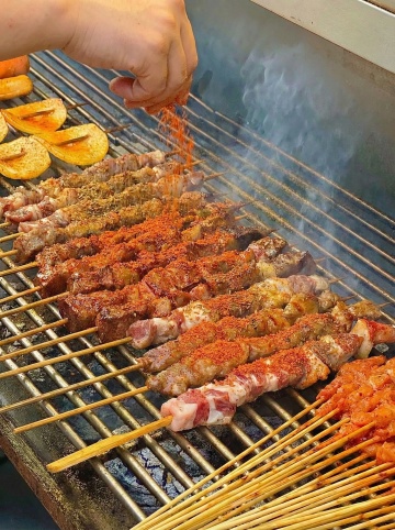 浓郁色彩的油画风格描绘热闹的烧烤夜市场景,前景是炭火上滋滋作响的烤肉串,肉质鲜嫩多汁,表面撒有香料,火焰跳跃舔舐着肉串,升腾的烟雾带着金色光晕,周围摆放着装有不同酱料和配菜的小碗,背景是虚化的暖黄色灯光和人影,整体画面充满烟火气与温暖氛围,笔触厚重富有质感,光影对比强烈,色彩饱和度高,强调食物的诱人光泽与夜市的热闹氛围。