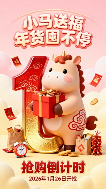 主体围绕开运美妆福袋展开:朱砂红展示架上,陈列着印祥云马纹的剪纸风美妆福袋,搭配小马挂饰、福字贴纸,既贴合马年生肖的祥瑞属性,又突出 “开运福袋” 的好运核心,传递囤货纳福的氛围。