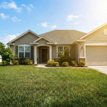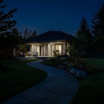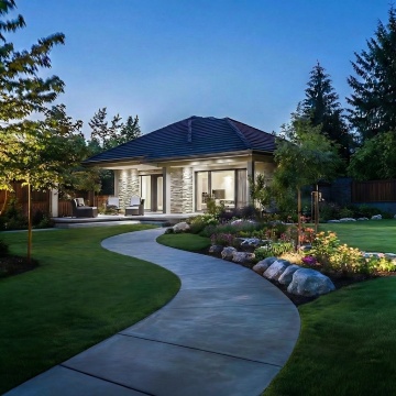现代简约风格的庭院,阳光明媚的白天,晴朗的蓝色天空点缀着几朵白云,庭院内有一栋两层现代简约风格的白色住宅,住宅外立面有大面积玻璃窗和深色框架,木质大门,门前有几级浅色石阶,周围种植着修剪整齐的绿色灌木、高大的树木和草坪,草坪上有石板小径,整体光影明亮,色彩清新自然,营造出宁静舒适的氛围。