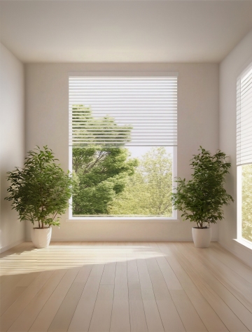 明亮简约的室内空间,不同角度展示的各式窗户,窗框设计简洁,搭配可调节的白色百叶窗,部分叶片打开,透过窗户能看到窗外郁郁葱葱的绿色树木和明媚的自然光,光线在浅色木地板上投下百叶窗的条状光影,窗边摆放着茂盛的绿色植物,整体氛围清新自然、宁静舒适,展现不同场景和布置下窗户与室内环境的和谐融合。