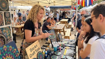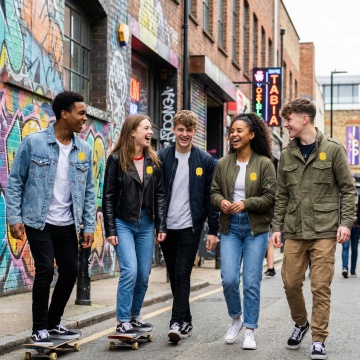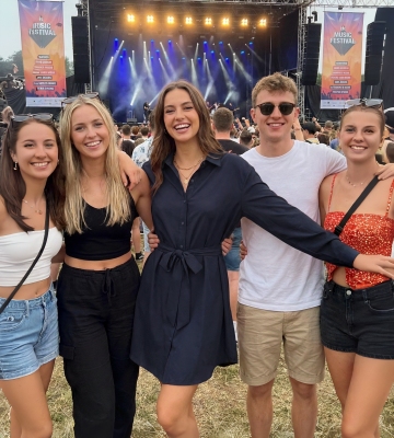 一群人手握装满金黄色啤酒的玻璃杯相互碰杯,杯壁上布满细密气泡,啤酒表面泛着洁白泡沫,阳光透过玻璃杯折射出温暖光泽,背景是户外音乐节现场,舞台上灯光绚丽,台下人群随着音乐舞动,空中漂浮着彩色气球和音符装饰,整体画面呈现出明亮欢快的氛围,光影效果柔和自然,色彩饱和度高,充满热闹欢庆的聚会气息。
