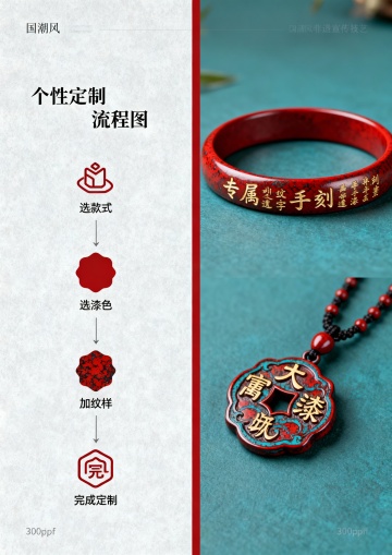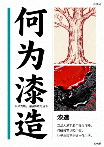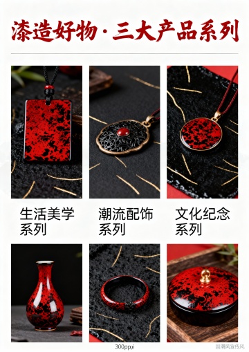 核心风格要求(所有页面通用前缀):国潮风,融合大漆非遗技艺元素(漆色、漆纹、漆工艺细节),现代简约审美,色彩以大漆经典色(朱红、乌黑、明黄、石青)为主,搭配低饱和辅助色,画面细腻有质感,版式干净留白合理,符合品牌年轻化定位,高清商业宣传册质感,300dpi,适合印刷第1页:封面提示词:国潮风品牌宣传册封面,主体展示“漆造”品牌Logo,Logo融入大漆髹涂纹理,背景为渐变朱红大漆底色,点缀细金漆线条勾勒的传统缠枝纹,右上角标注核心定位“千年大漆,玩转出圈”,右下角小字“非遗大漆年轻化品牌”,整体风格大气简约,视觉中心突出,无多余元素第2页:品牌引言·何为漆造提示词:国潮风宣传册内页,左侧大面积留白,用乌黑漆色书写标题“何为漆造”(书法字体),下方配小字“以漆为媒,连接传统与当下”;右侧分上下两个小版块,上方是浅米色背景搭配朱红漆线勾勒的大漆树简笔画,下方是简洁文字区域(文字内容占位符:“漆造,立足大漆非遗年轻化传播,打破技艺认知门槛,让千年漆艺走进当代生活”),画面左侧加1条细石青漆色竖线分割,整体雅致有呼吸感第3页:核心定位·千年大漆 玩转出圈提示词:国潮风宣传册内页,版式左右分栏,左侧朱红大漆底色,用金色字体突出核心定位“千年大漆,玩转出圈”,背景暗纹为大漆推光工艺的细腻光泽纹理;右侧浅灰色背景,上方是“定位解读”标题(石青漆色),下方用简洁图标+文字占位符呈现核心逻辑:“传统漆艺传承+潮流载体创新+情感互动体验”,每个逻辑点搭配简约漆艺元素图标(漆刷、潮流配饰、握手符号)第4页:非遗底蕴·大漆的千年传承提示词:国潮风宣传册内页,上方通栏展示大漆技艺历史场景简绘(低饱和度水墨风格,描绘古代工匠髹漆场景),下方分两栏,左栏标题“大漆非遗的文化内涵”(乌黑漆色),配朱红漆色细边框;右栏标题“千年技艺的当代价值”(乌黑漆色),同样配朱红漆色细边框,两栏均预留文字占位符区域,背景点缀细微漆粉质感纹理第5页:品牌Logo设计解析提示词:国潮风宣传册内页,左侧主体展示“漆造”Logo完整图形,Logo采用朱红与乌黑撞色,融入大漆缠枝纹与“漆”字意象,右侧分三个小版块,分别标注“色彩寓意”“纹样灵感”“字体设计”,每个版块搭配对应简约图标(调色盘、缠枝纹、字体符号),背景为浅米色,所有分割线采用石青漆色,突出设计细节第6页:品牌IP形象·漆小匠提示词:国潮风宣传册内页,左侧大面积展示IP形象“漆小匠”全身图(卡通形象,身着融合漆艺元素的潮流服饰,手持漆刷,面带微笑,形象活泼可爱),右侧展示IP三个不同动作表情(挥手、举产品、讲解漆艺),下方标注IP形象定位“漆艺文化传播小使者”,背景为浅灰色,点缀朱红漆色小圆圈装饰,整体风格童趣且不失国潮质感第7页:产品系列总览·漆造好物提示词:国潮风宣传册内页,上方通栏标题“漆造好物·三大产品系列”(朱红漆色书法字体),下方三栏均等分布,每栏展示一个产品系列的代表性产品缩略图(搭配简约文字标题:“生活美学系列”“潮流配饰系列”“文化纪念系列”),每个缩略图背景为乌黑漆色,点缀细金漆线条,整体版式规整,层次分明第8页:生活美学系列·漆韵日常提示词:国潮风宣传册内页,左侧展示3件生活美学系列产品(漆盘、漆杯、漆收纳盒),产品摆放错落有致,搭配简约绿植点缀,背景为浅米色,突出产品的大漆质感(推光光泽、纹理细节);右侧为文字区域,标题“漆韵日常”(石青漆色),下方预留产品介绍文字占位符,加朱红漆色细边框装饰第9页:生活美学系列·细节质感提示词:国潮风宣传册内页,采用多图拼接版式,展示生活美学系列产品的细节特写(漆盘的缠枝纹雕刻细节、漆杯的髹涂纹理、收纳盒的开合处工艺),每个特写图搭配简约文字标注(“缠枝纹雕刻”“多层髹涂”“手工打磨”),背景为乌黑漆色,用金色线条分割画面,突出大漆技艺的精湛细节,整体风格高端有质感第10页:潮流配饰系列·漆尚潮流提示词:国潮风宣传册内页,右侧展示4件潮流配饰系列产品(漆手镯、漆项链、漆发簪、漆钥匙扣),产品佩戴在模特手上/颈部(模特只露局部,突出产品),背景为朱红渐变漆色;左侧为文字区域,标题“漆尚潮流”(乌黑漆色),下方预留产品介绍文字占位符,搭配潮流元素图标(爱心、潮流符号),整体风格时尚动感第11页:潮流配饰系列·个性定制提示词:国潮风宣传册内页,左侧展示个性定制流程示意图(图标+文字:选款式→选漆色→加纹样→完成定制),背景为浅灰色,分割线用朱红漆色;右侧展示2件定制款配饰(刻有专属文字的漆手镯、定制纹样的漆项链),产品特写,背景为石青漆色,突出定制的独特性,整体版式清晰易懂第12页:文化纪念系列·漆承文脉提示词:国潮风宣传册内页,上方通栏展示文化纪念系列代表产品(漆制书签、漆制摆件、漆制礼盒),摆放在简约木质展示架上,背景为浅米色,点缀传统文化元素(竹简、印章);下方为文字区域,标题“漆承文脉”(朱红漆色书法字体),预留产品介绍文字占位符,整体风格庄重且有文化底蕴第13页:情感互动·漆艺体验活动提示词:国潮风宣传册内页,左侧展示漆艺体验活动场景简绘(多人参与手工髹漆,氛围轻松愉悦,低饱和度色彩),右侧分两个版块,上方标题“漆艺互动·传承有你”(石青漆色),下方列出2个核心体验活动(“手工漆杯制作工坊”“漆纹拓印体验”),每个活动搭配对应图标(