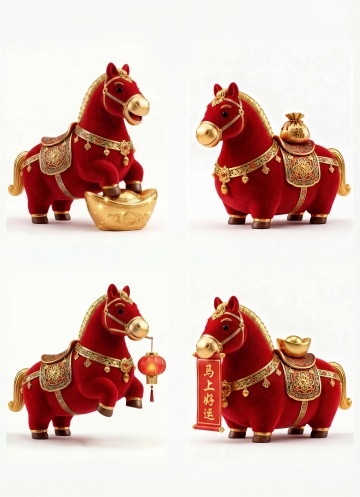 喜庆红金配色,软3D卡通马身覆绒面质感,中式纹饰与鎏金元素结合,搭配元宝、灯笼与“马上好运”卷轴,营造浓郁节日氛围。