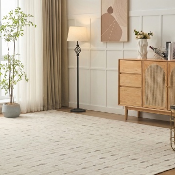 现代家具场景,地毯特写,极简主义风格,以浅灰色、米白色和白色为主色调,柔和的自然光从巨大的落地窗洒入,在地面和家具上形成清晰的光影层次和柔和的阴影,大面积铺设的浅灰色条纹地毯占据画面主要部分,质地柔软,纹理细腻,地毯前摆放着浅灰色的布艺沙发,沙发上有几个同色系的靠垫,沙发旁是一个圆形的金属框架小茶几,背景墙为浅灰色,墙上有一个细长的置物架,上面放着一个相框,整体空间干净整洁,线条简洁流畅,营造出宁静、舒适、高级的居家氛围,具有强烈的现代设计感和空间感。