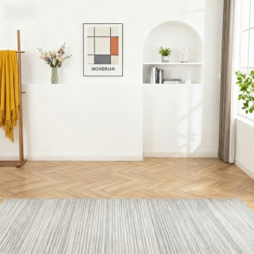 现代极简风格的客厅场景,以浅灰色调为主的现代家具布置,画面聚焦于铺在浅灰色瓷砖地面上的浅灰色条纹地毯特写,地毯表面有细腻的竖条纹纹理和柔软的编织质感,占据画面下方大部分区域;背景中可见浅灰色布艺沙发,搭配几个同色系的靠垫,沙发旁有一个圆形金属边框的小茶几,靠墙处有一个简约的灰色搁板,上面放置一个小型装饰画框;右侧是大面积的落地窗,透过轻薄的白色纱帘洒入明亮柔和的自然光,光线在地毯和地面上形成自然的光影过渡,窗外可见模糊的绿色植物,整体营造出宁静、整洁、高级的现代家居氛围,空间感开阔,线条简洁,色彩统一和谐,具有清晰的视觉层次和舒适的居住感。