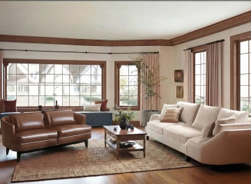 清新自然的客厅场景,融合简约主义与轻拟物风,柔和光影洒落木质地板,3D质感呈现舒适实景感,绿植与米白沙发交织出宁静氛围。