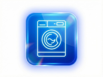 俯视角构图,极简主义厨房场景中央,一台哑光白前置式滚筒洗衣机舱门呈优雅的45度角半开状态,露出内部精密的银色不锈钢内筒与几何排列的波浪提升筋,正面圆形旋钮控制面板镶嵌着冰蓝色LED显示屏,机身侧面的激光雕刻竖纹在斜射的自然光下形成细腻的光影层次。洗衣机静置在深海蓝水磨石地面上,倒映出机身流畅的轮廓线,背景是渐变的冰川蓝哑光墙面,右侧悬挂着由黄铜支架固定的透明玻璃搁板,上面整齐排列着三瓶不同容量的薰衣草香薰洗衣液,液体在光线折射下呈现出淡紫色光晕。整体色调以冷调白与深海蓝为主导,金属部件反射出柔和的高光,营造出兼具专业实验室般的精确感与居家空间的温馨氛围。
