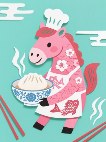 一匹姿态昂扬的骏马,身披红色绸缎,鬃毛和尾巴飘逸,马蹄踏在金色祥云上,周围环绕着红灯笼、中国结和金色烟花,背景是淡红色渐变,整体风格喜庆吉祥,充满新年氛围