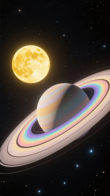 深邃浩瀚的宇宙星空背景,中心是一颗带有清晰环状结构的行星,行星表面有明暗相间的纹理和隐约可见的地貌特征,环状结构呈现出多层次的同心圆,边缘有金色光晕。行星前方有明亮的光源,光芒向四周扩散形成温暖的橙黄色渐变光带。行星周围分布着三颗大小不一的黑色星球,其中一颗较大的星球外围有明显的金色光环。右上角有一个巨大的、带有条纹纹理的气态行星,占据画面右上角部分区域。背景中布满了无数闪烁的星星和弥散的星云,星云呈现出淡淡的粉紫色和橙色交织的云雾状。整体画面采用高写实的3D渲染风格,光影效果强烈,色彩以深邃的黑色为基调,搭配金色、橙黄色的光芒和光晕,营造出神秘、壮丽、浩瀚的宇宙氛围,细节丰富,具有强烈的视觉冲击力和空间纵深感。