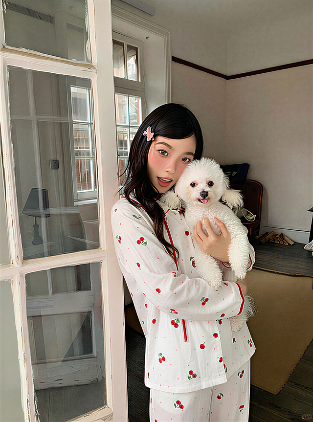 竖幅拍立得样式(整体比例 3:4,含白色边框); 近景(人物上半身 + 宠物头部至胸部);85%(人物 + 宠物,宠物占比略高于人物);人物主体参考图1中人物(脸型、五官、头型必须严格保持一致),眼神清澈去除原配饰和原背景,人物身穿 (浅燕麦灰软糯针织开衫:低饱和浅燕麦灰, 材质羊毛 + 羊绒混纺针织, 版型区分 (女生款:半高领款(领口高度至颈部 1/2 处)+ 常规宽松版型(衣长至胯部)+ 前襟 5 颗深色纽扣;男生款:翻领款(小方领设计)+oversize 宽松版型(衣长至大腿上部)+ 前襟 3 颗深色纽扣), 通用细节两侧对称贴袋(袋口为针织包边)); 下装组合 (女生下装:浅卡其色阔腿休闲裤,版型高腰超宽松款(裤腿宽度 22cm,裤长盖过鞋面), 材质纯棉斜纹面料, 风格适配与浅燕麦开衫形成同色系渐变,男生下装:深棕色阔腿休闲裤,版型高腰宽松款(裤腿宽度 20cm,裤长盖过鞋面), 材质灯芯绒厚款面料(带轻微肌理感),一半脸躲在宠物头的后面,单侧右眼睛被宠物头部完全遮挡,仅露出左眼和眯眼带笑的表情,神态亲昵放松,右手四指紧紧贴合宠物鼻子上方,手掌贴合鼻子和嘴筒的左侧脸颊,大拇指紧紧贴合宠物下巴,左手食指扣住宠物左耳上方,其他手指并拢紧贴宠物脑袋左上方,右腿微屈,膝盖向画面内侧收拢(近景中仅可见膝盖上部轮廓);人物主体参考图2中宠物,宠物头顶有 “Canon” 字样的装饰(模拟相机镜头盖效果,字体黑色或白色,根据宠物毛色变化,选择与毛色有反差的颜色),眼神温和直视镜头,姿态放松;人物头顶无文字,人物妆容自然清透,无明显妆感,贴合原生肤质+素颜系淡妆,仅提亮肤色, 宠物眼神圆睁直视镜头,口鼻湿润有轻微光泽,头部向前完全贴靠人物面部,头部无抗拒姿态,呈现放松亲昵状态; 室内自然光(主光源位于画面左侧,光线柔和扩散),无硬阴影,1:1.2(柔和无对比); 暖调日常色系(整体饱和度 45%), 拍立得胶片质感(分辨率 2K,带轻微自然模糊); 滤镜色调 (拍立得胶片滤镜(模拟富士 instax mini 质感)+ 暖黄调日常滤镜(色温 4800K,色调偏移 + 5)+ 画面边缘轻微暗角(暗角强度 10%)+ 细胶片颗粒(颗粒尺寸 0.5px,密度 15 颗粒 / 100px²)+25%(保留原生细节)); 模糊室内浅米色墙面(无额外装饰); 白色边框(覆盖画面四周,宽度占整体10%),自然随拍构图详情