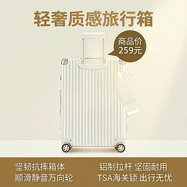 奶白色磨砂拉杆行李箱,保持产品角度和大小完全不变,保持物理结构绝对不变,严禁扭曲变形。将背景替换为明亮温馨的室内小清新风格,浅米色奶油风空间,浅木色地板,窗边漫射柔光,整体氛围干净治愈,低饱和度莫兰迪色系,商业高端摄影,4K超清。负向词:西方面孔,金发,深眼窝,雀斑,杂乱房间,死黑阴影,硬光,乡村风,高对比度,欧美妆容,接口错位,塌陷,扭曲,划痕,廉价塑料感,摄影灯,水印,文字,昏暗,比例失调,模糊,粗糙边缘,畸变,透视错误,杂乱背景,同类商品详情