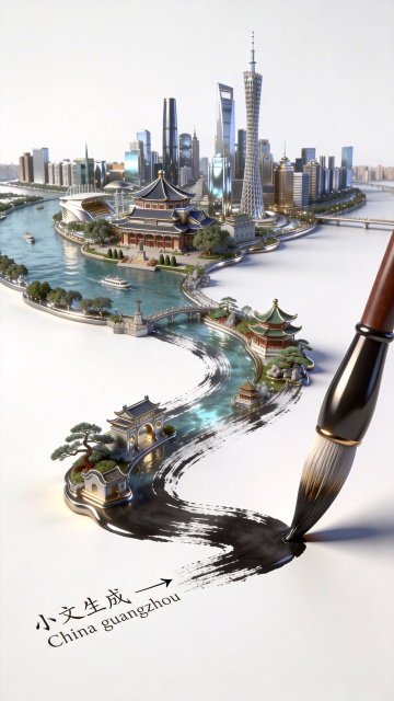 水墨风与3D风交融,毛笔挥洒出广州城景,国潮风韵中融入现代都市天际线,虚拟现实感十足,展现中式美学与科技感的梦幻结合。