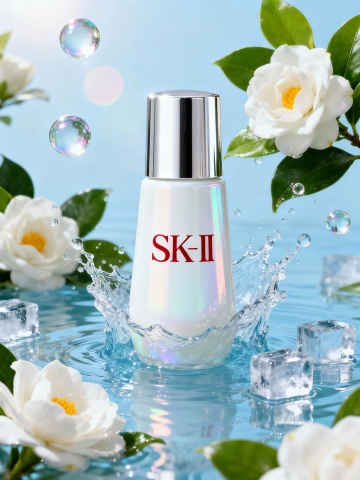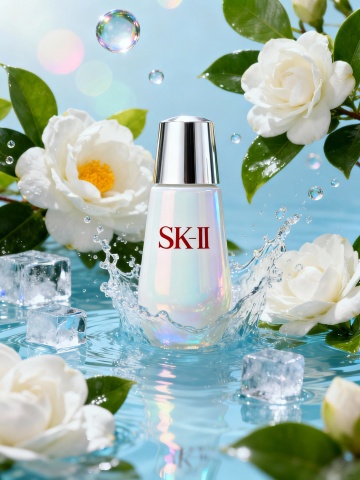 清新玻璃瓶置于虚拟自然水景中,花影轻舞,尽显清爽与清透感。