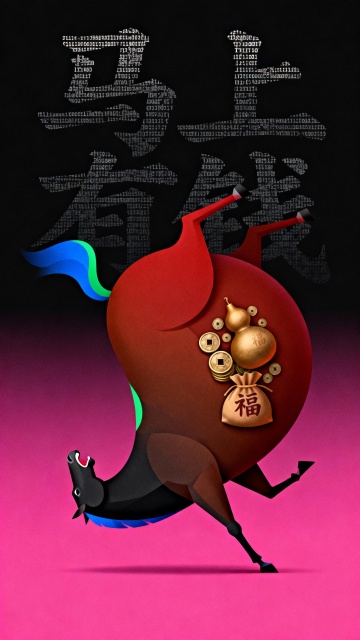 国潮风插画,拟人化骏马驮福袋与铜钱,背景代码云朵呼应数字时代,霓虹粉红底色强化喜庆感,印刷风文字点缀,融合传统与未来。