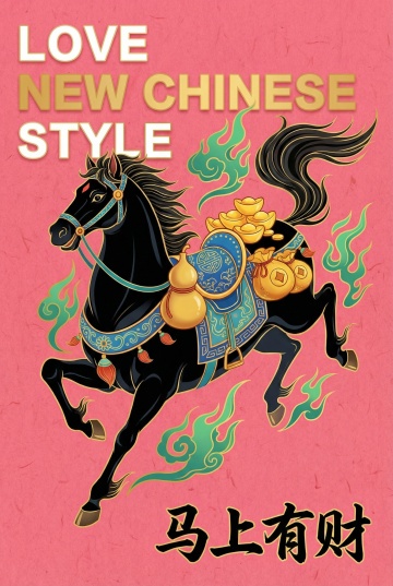 国潮风融合描边与重拟物手法,鎏金元素点缀,喜庆红底衬托奔马驮财,象征“马上有财”,传递新春祝福。