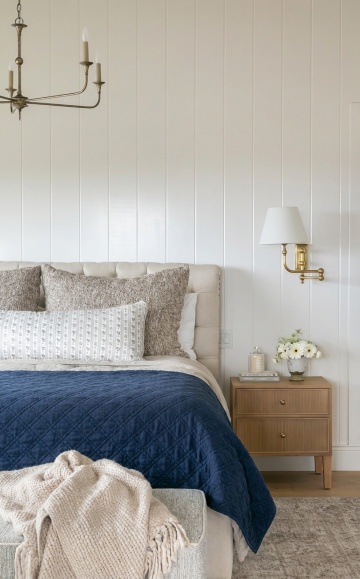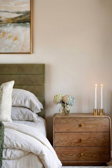 极简风格卧室室内设计,以浅米色墙面为背景,搭配原木色实木床架,铺着浅灰色亚麻质感床单,床头摆放两个浅米色方形靠枕和两个浅灰色长条形枕,床尾随意搭着一条米白色针织毯。床的左侧是原木色床头柜,上面放置一个白色陶瓷小花瓶,插着几根干枝,旁边有一个白色小茶杯和托盘。床头柜上方墙面挂着一幅极简风格装饰画,画框为原木色,画面是三束黑色线条勾勒的麦穗图案。床的右侧是一盏白色金属落地灯,灯罩为米白色布艺材质。床前浅色木地板上铺设一块米白色长方形棉麻地毯,地毯上放着一个圆形编织篮,篮子里有一本翻开的书。整体色调以米色、浅灰、原木色为主,光线柔和,营造出宁静、舒适、简洁的氛围,空间布局对称平衡,线条干净利落,无多余装饰,体现极致的简约美学。