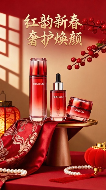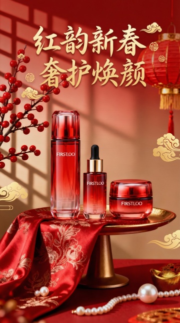 主体内容:FIRSTLOO新年护肤礼盒组合(红金包装礼盒、精华油、面霜、(红色包装)一只护手霜(红色包装),产品印中式纹样标识);场景设定:深色岩石展示台+红渐变色背景;风格参考:高端国潮新年美妆海报;色彩色调:正红+烫金+深黑+暖橙(渐变背景);构图视角:竖版中心构图(产品错落摆放);附加细节:点缀红梅花枝+红果装饰,礼盒印波纹暗纹,背景光线柔和有质感,整体呈现精致喜庆的新春氛围。