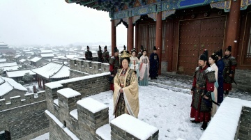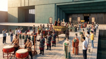 中式古典场景,3D重拟物风呈现古代城建实景,水墨与岩彩元素融合,人物服饰考究,展现先民筑城劳作的生动画面。
