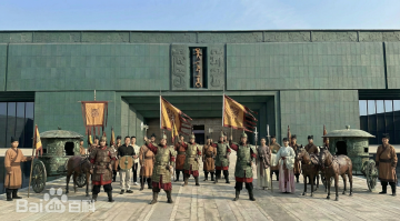 古城西安城墙上呈现气势磅礴的"西安"巨大的景观字,每个笔画由卷起翻滚的砖石组成,美丽的天空,树林远处隐约有一支考古队伍