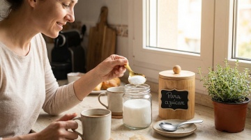 现代简约风格厨房窗台特写,自然光透过大面积玻璃窗洒入,形成明亮温暖的氛围,浅色木质台面纹理清晰,左侧摆放装满橙子和青柠的白色陶瓷碗,旁边是两个玻璃调味罐和一块木质砧板,中央透明玻璃花瓶中种植着新鲜香草,右侧立着装有木质厨具的白色容器,窗边散落着两个洋葱,窗外是模糊的绿色植物和自然景色,整体色调以米白、原木色和清新绿色为主,光影柔和,细节质感丰富,充满生活气息与自然和谐感。