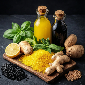 一张具有不同样式风格与配色的餐桌背景,桌面上铺着带有自然纹理的桌布,散落着各种新鲜的蔬菜和香草,整体呈现出温馨、自然的生活气息,光线柔和,色彩和谐,营造出舒适的用餐氛围,细节丰富,质感真实,具有强烈的视觉吸引力。