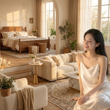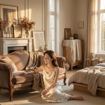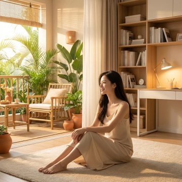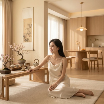 明亮通透的室内场景,柔和的自然光从法式玻璃门洒入,照亮整个空间,营造出宁静、舒适、温馨的氛围。前景中,一位穿着素雅连衣裙的女性侧身坐在藤编椅上,手持书本,姿态放松惬意,脚边散落着一双拖鞋,地面铺有浅色编织地毯。背景是两扇宽大的落地窗,悬挂着带有黑色书法文字图案的米白色亚麻质感窗帘,窗帘轻盈垂坠,随风微拂,书法字体飘逸洒脱,充满东方韵味。房间内陈设简约雅致,一旁的木质边桌上摆放着一盏造型古朴的台灯,光线柔和。窗外可见郁郁葱葱的绿色庭院,增添自然生机。整体画面采用写实风格,光影过渡自然,色彩以米白、浅灰、原木色为主调,温暖和谐,细节丰富,质感细腻,构图遵循三分法,视觉焦点集中在人物与窗帘的互动关系上,传递出悠闲自在的生活情调。