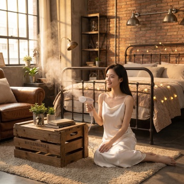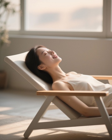 极简主义风格卧室,明亮柔和的自然光透过半透明白色纱帘洒满房间,整体色调以纯净的米白色、浅木色为主,营造出宁静、温馨、舒适的氛围。房间内有简约设计的浅木色单人沙发,沙发上随意搭着一条浅棕色针织毯子,旁边配有小巧的圆形木质边几,上面摆放着插有干燥芦苇的白色陶瓷花瓶。地面铺设浅色木地板,中央放置一块浅色编织地毯,地毯上有一本翻开的杂志。背景墙为纯白色,墙上挂着一幅线条简约的几何装饰画,画框为细窄的金色。采用开放式布局,视觉层次分明,空间感通透,光线柔和均匀,阴影细节自然,材质表现细腻,如纱帘的轻盈垂坠感、木质家具的温润纹理、针织毯子的柔软质感。