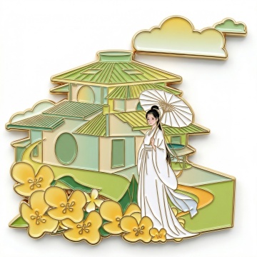 中式建筑微缩插画徽章,融合复古描边与金属浮雕工艺,喜庆色彩搭配祥云、花鸟元素,展现浓厚民族风情与节日氛围。
