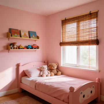 极简主义风格的儿童卧室,温暖柔和的原木色与米白色为主色调,自然光从侧面窗户洒落形成柔和的光影效果,细腻的木质纹理与编织质感的地毯和收纳篮,浅米色墙壁上挂着装饰画,不同形态和布置的木质家具(如带抽屉的储物柜、简约单人床),地面散落着不同尺寸的毛绒玩具熊,整体营造出温馨舒适、简约自然的氛围,干净整洁的空间布局,柔和的光线带来宁静惬意的感觉,不同布置的背景中保持原木色系与编织元素的统一风格。