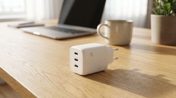 赛博朋克风格的智能手机充电场景,霓虹蓝与紫色渐变光效笼罩,手机屏幕显示动态赛博数据流图案,充电器和数据线呈现金属质感与霓虹灯带装饰,白色桌面转化为带有电路纹理的黑色高科技平台,背景墙变为布满全息投影广告和管线的未来都市夜景,整体光影对比强烈,充满未来科技感与机械美学,高细节,8K渲染,电影级构图