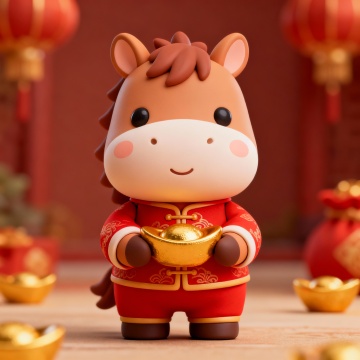 软3D风格的可爱小马,身着红色唐装,手持中国结,拟人化设计充满喜庆感与节日氛围,面料质感细腻,卡通形象萌趣十足。
