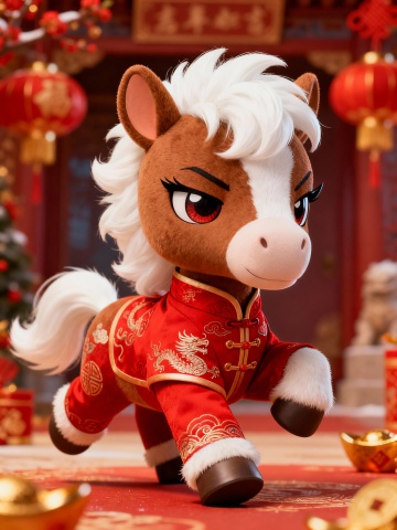 软3D风格的可爱小马,身着红色唐装,手持中国结,拟人化设计充满喜庆感与节日氛围,面料质感细腻,卡通形象萌趣十足。