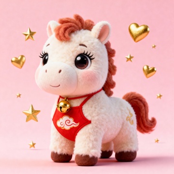 软3D风格萌马,毛发生长质感细腻,身穿红色云纹肚兜,搭配金色铃铛与心星点缀,喜庆可爱,充满节日氛围。