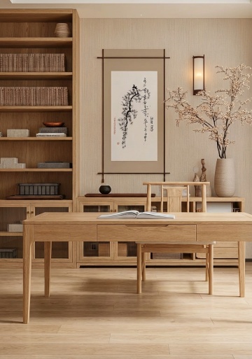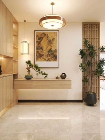 俯视角构图,一座充满侘寂美学的日式客厅,浅灰色亚麻布艺转角沙发搭配三个深棕色棉麻靠垫,沙发前铺设着带有自然纹理的浅橡木色低矮茶几,茶几上静置着一个粗陶花瓶,插着两枝干枯的芦苇。左侧墙面悬挂着三幅无框水墨挂画,右侧立着一个原木色梯形置物架,摆放着几个手工陶瓷器皿。自然光从右侧木质格栅推拉门温柔渗入,在深灰色微水泥地面上投下斑驳的光影,墙角处一盆琴叶榕舒展着宽大叶片,置于粗陶花器中。天花板悬挂着一盏纸灯笼造型吊灯,整体色调以原木色、浅灰和米白为主,营造出宁静质朴、岁月静好的氛围,细节处彰显自然材质的肌理之美。