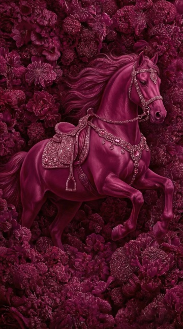 工笔风骏马,融国潮与鎏金元素,刺绣纹样华丽,浮雕质感凸显古典奢华,红金配色尽显喜庆祥瑞。