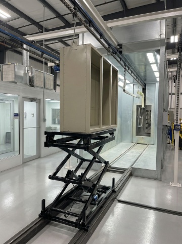 现代化工业场景,蓝色为主色调,清新明亮的光线,干净整洁的生产线,透明玻璃幕墙外是蓝天白云,绿色植物点缀在车间角落,机械臂精准运作,地面反光如镜,整体氛围充满科技感与希望
