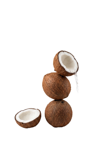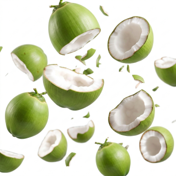 超高清摄影级别真实感,一个被劈开的新鲜椰子,外壳呈棕褐色带有天然纹理,内部白色椰肉质地细腻,椰子水从椰壳中飞溅而出形成动态的白色水花,水珠晶莹剔透,整体光影立体感强,光源来自上方形成自然的高光与阴影,背景为纯白色,突出椰子的自然质感与水花的动态效果,画面清晰锐利,细节丰富,色彩还原真实自然。