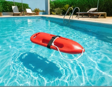 夏日泳池场景,高清晰度写实摄影风格,明亮阳光照射下的清澈蓝色池水,池壁由白色和深蓝色瓷砖铺砌,带有金属扶手的泳池阶梯部分浸入水中,水面波光粼粼并反射出耀眼的光斑,池边铺设浅棕色防滑地面,边缘点缀着色彩鲜艳的夏季花卉如粉色和黄色的绣球花,几只彩色充气游泳圈随意放置在池畔,远处可见白色遮阳伞和蓝白条纹的躺椅,营造出轻松愉快的夏日度假氛围,温暖的色调,清晰的光影对比,自然的阴影投射,整体画面充满夏日活力与清凉感。