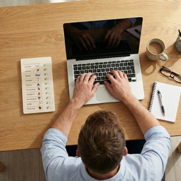 明亮的现代办公室环境,柔和的自然光透过大面积玻璃窗洒入室内,温暖的木质办公桌,桌上放着笔记本电脑、打开的笔记本、蓝色马克杯和一支铅笔,穿着米色开衫与白色衬衫的女性正在专注地使用笔记本电脑,背景有白色书写板、木质书架和简约办公家具,整体风格简约、专业、温馨,具有清晰的空间层次感和舒适的工作氛围,高清晰度,写实摄影风格,柔和光线,自然色彩。