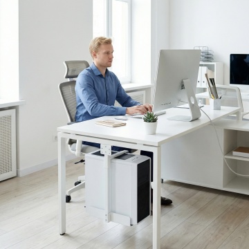 明亮通透的现代办公室环境,自然光透过大面积玻璃窗洒入,照亮浅色木质办公桌,桌面上放着银色笔记本电脑、打开的记事本、蓝色马克杯和一支铅笔。一位金发扎成马尾的女性,穿着白色衬衫和米色开衫,面带微笑专注地使用笔记本电脑。背景中可见白色磁性白板、木质书架和简约办公家具,整体风格简约清新,色调以原木色、白色和浅蓝色为主,光线柔和自然,营造出专业且舒适的工作氛围,可从不同角度展示办公室内的其他区域如会议区、休闲区或不同工位布局,保持相同的现代简约风格和明亮采光。