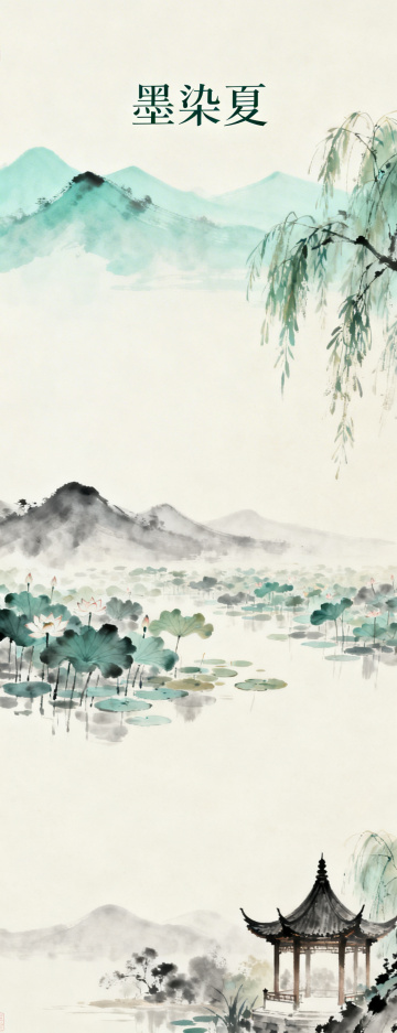 水彩与工笔交融的中式秋景,湖畔亭台、孤舟远影,金黄落叶映衬静谧山水,水墨晕染间透出古典唯美意境,尽显文艺诗意。