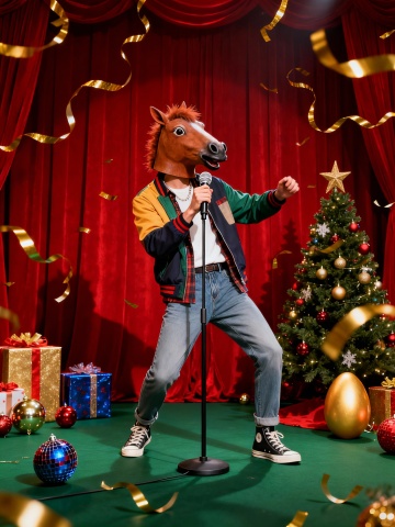 3D风拟人马头模特登台,霓虹灯与波普艺术字体营造喜庆综艺感,融合潮流塑料风与粒子飞舞的节日氛围,呈现双旦促销的趣味时尚盛宴。