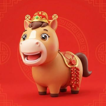 软3D风格的拟人化小马,身披国潮风华服,头戴鎏金冠,喜庆又可爱,融合卡通感与塑料质感,传递新春祝福。