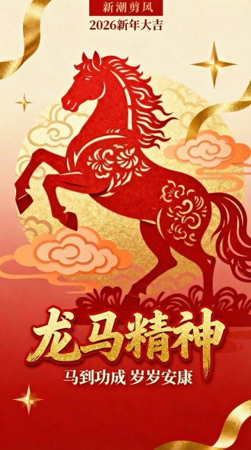 主体内容:2026马年主题海报,含多匹红金剪纸风骏马、“万马奔腾”书法大字;场景设定:正红+深金渐变背景;风格参考:国潮剪纸风新年海报;色彩色调:正红+烫金+深红;构图视角:竖版全景构图;附加细节:背景加金色烟花、祥云特效,顶部标“HAPPY NEW YEAR 2026”。