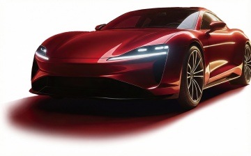 一辆设计感十足的白色豪华电动跑车,采用流线型车身设计,前脸造型犀利,LED大灯炯炯有神,车身侧面线条流畅动感,黑色轮毂搭配黄色刹车卡钳,停放在一个深色反光地面的空旷空间中,地面有白色线条装饰,背景为纯黑色,营造出高端、科技、神秘的氛围,无任何文字信息,光线从前方和侧面照射,在车身上形成明显的光影对比,凸显出汽车的硬朗轮廓和精致细节。
