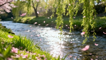 晨雾弥漫的竹林深处,一束金色的阳光如舞台追光般穿透薄雾,照亮一株斜逸而出的翠竹,竹节上凝结的露珠在光线中闪烁如碎钻,几片新抽的嫩绿竹叶低垂着触碰水面,激起一圈圈涟漪,倒影与实景在静谧的水面交织成迷离的双重世界,远处竹林层层叠叠融入朦胧的青灰色雾霭,空气中漂浮着细密的光尘,色调是清冽的翡翠绿与晨雾的柔白交织,营造出空灵而湿润的东方意境。