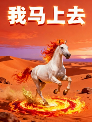 3D重拟物风格,火焰与粒子交织的梦幻沙漠场景,白马踏火奔腾,光影动感十足,充满热血与酷炫张力。