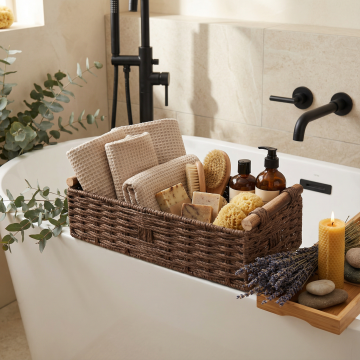 极简主义风格浴室设计,柔和的米白色墙面,温暖的自然光透过白色窗帘洒入,形成柔和的光影效果,地面铺设浅色大理石瓷砖,中央放置一个造型简约的独立式白色浴缸,黄铜色金属水龙头,浴缸旁地面随意摆放一条浅灰色柔软毛巾,右侧角落有一盆绿色植物置于编织篮中,整体氛围宁静、优雅、舒适,布局简洁开阔,空间感强,材质质感细腻,色彩和谐统一,营造出高级而温馨的沐浴环境。