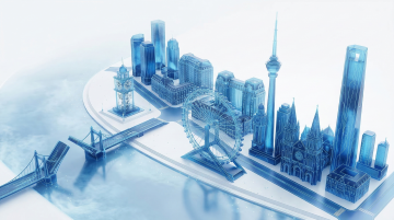 城市地标剪影风格,以深蓝到浅蓝的渐变色彩填充,呈现不同城市的标志性建筑轮廓,包括高楼大厦、特色塔楼和桥梁,建筑剪影边缘清晰,内部有规律排列的白色小方块作为窗户细节,整体构图对称平衡,下方配有清晰的水面倒影,倒影与主体轮廓完全对称且色彩稍浅,背景为纯白色,营造简洁现代的设计感。